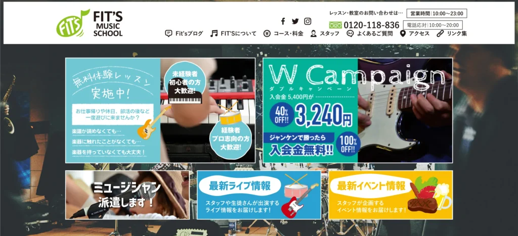 | 特徴 | 楽器プレゼント 補講無料(ENJOY保証) お洒落なラウンジ オールフリー制・固定制選択可 |