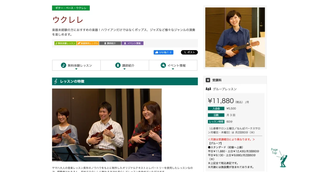 心斎橋, 梅田 等 | 有料 | ・老舗楽器店 ・ハワイアンコースあり |