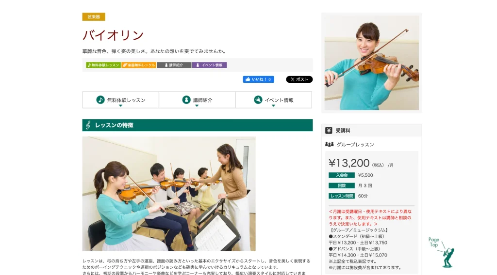 | 特徴 | ・現役ヴァイオリニストによる直接指導 ・音高・音大受験の専門コースあり ・入会金無料、1レッスン制の柔軟な料金体系 |