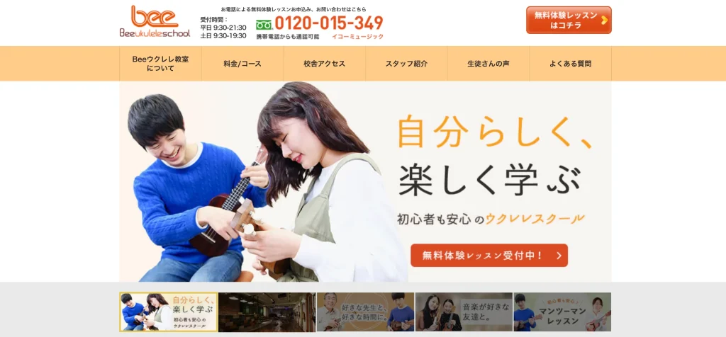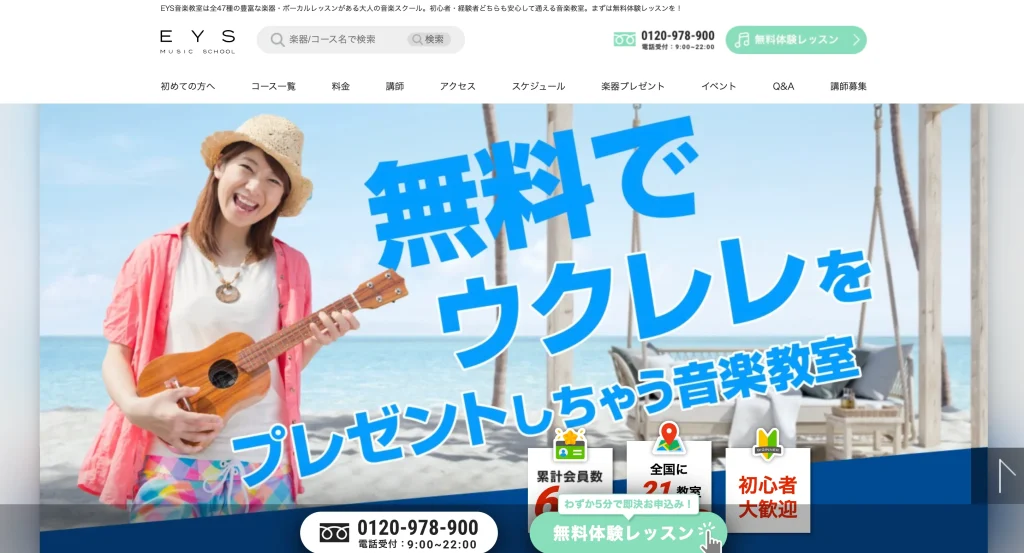 最大の特徴は、入会者に楽器をプレゼントするキャンペーンを実施している点で、ウクレレを持っていない初心者には非常に魅力的です。